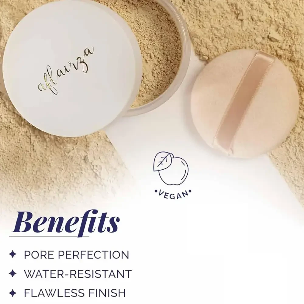 Aflairza's Translucent Powder - the ultimate finishing touch for any makeup look! Designed to seamlessly blend with all skin tones and types, this versatile powder ensures a flawless, long-lasting finish.