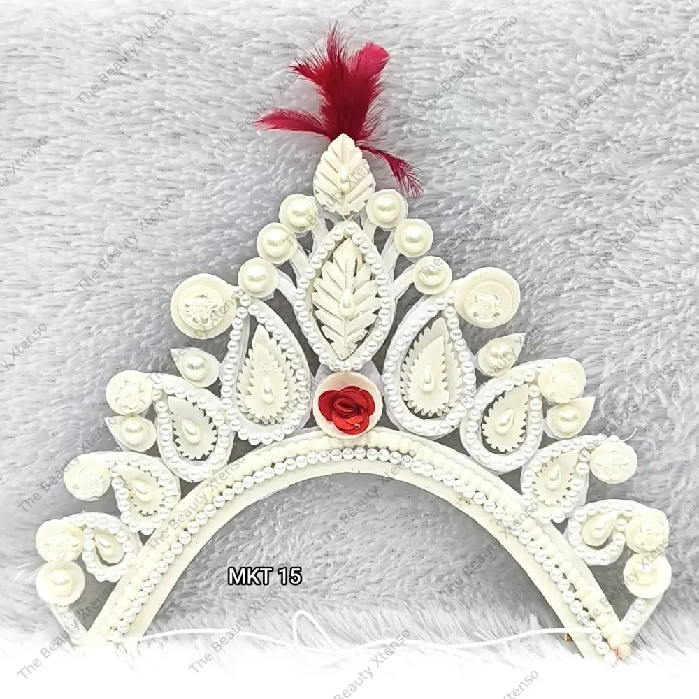 A "mukut" is a crown or headgear, often associated with royalty, deities, and significant life events like weddings. In Bengali culture, the "mukut" is a significant bridal accessory, traditionally made of sola (a type of pith) and symbolizing grace, purity, and the beginning of a new chapter. It can also be used to adorn deities in religious contexts, representing power, honor, and glory.
