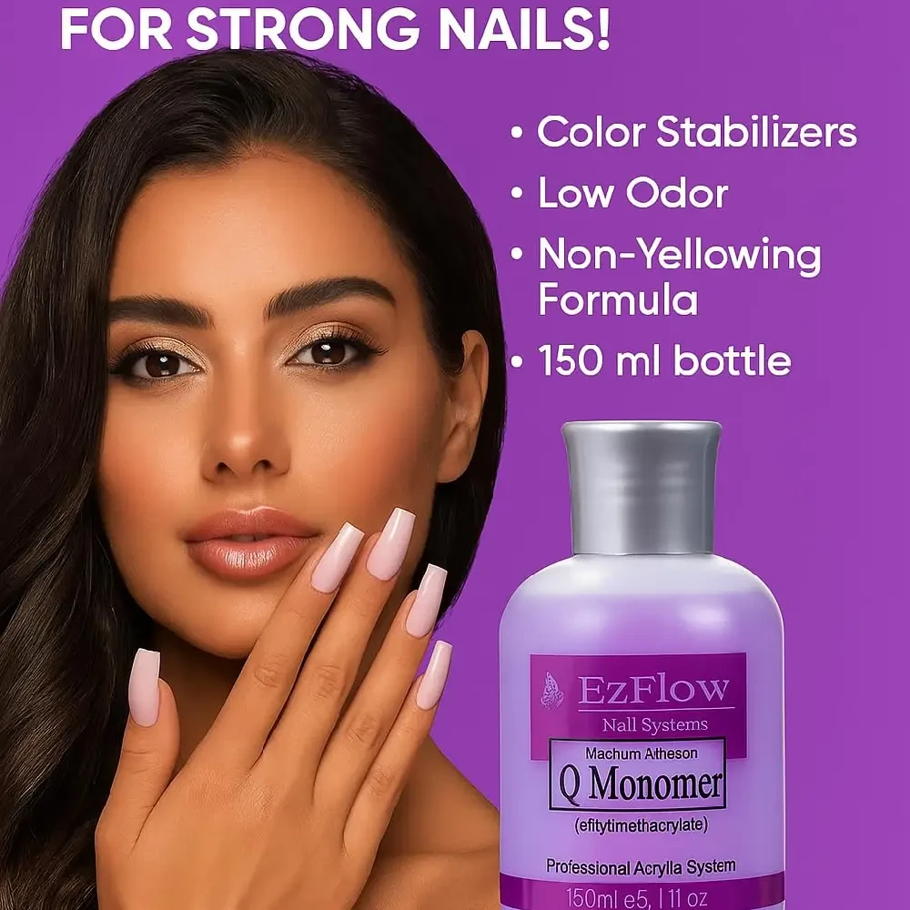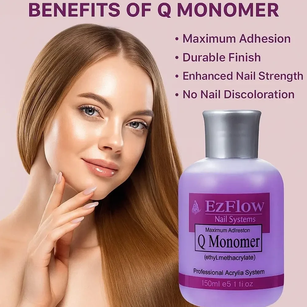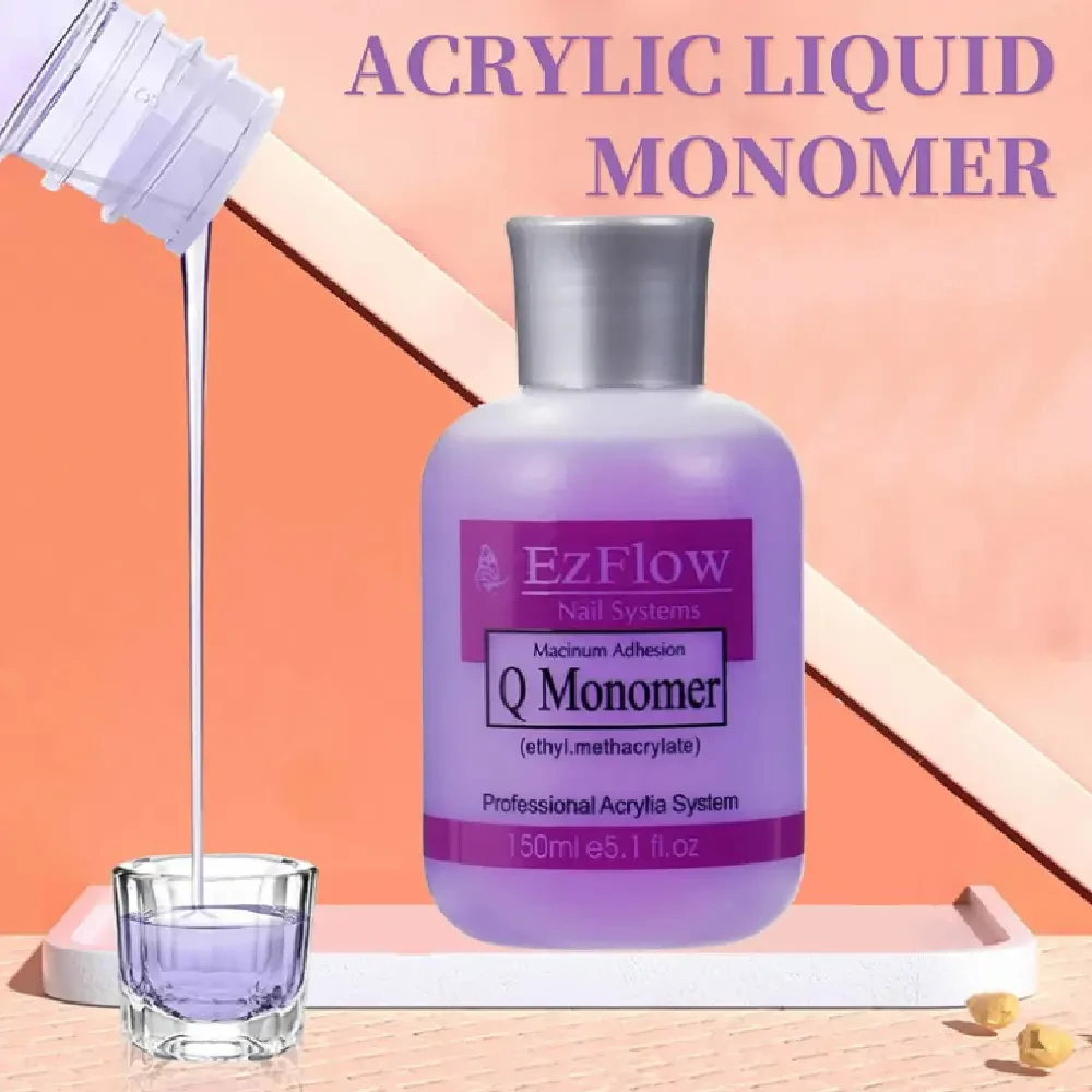Ezflow Q Monomer is a professional-grade liquid monomer designed for creating durable and beautiful acrylic nails with excellent clarity and strength. It features color stabilizers to prevent yellowing and plasticizers to reduce chipping and breakage. The formula also includes "Cross Link" molecules, which increase strength while minimizing weight and thickness.