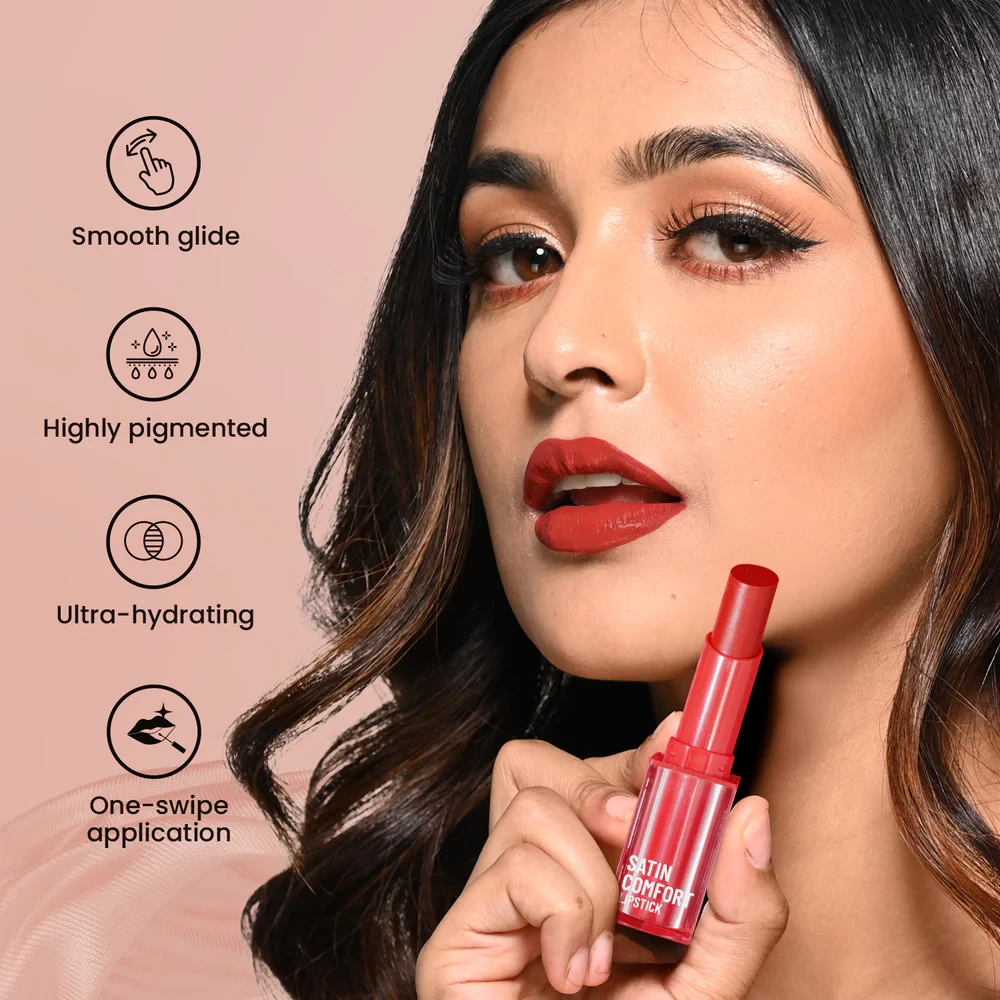 Available in varied hues, from elegant nudes to rich reds, Swiss Beauty Satin Comfort Lipstick lets you express your style with ease. Its versatile satin matte finish makes it the ideal choice for any makeup look, and the easy one-swipe application ensures flawless coverage every time.
